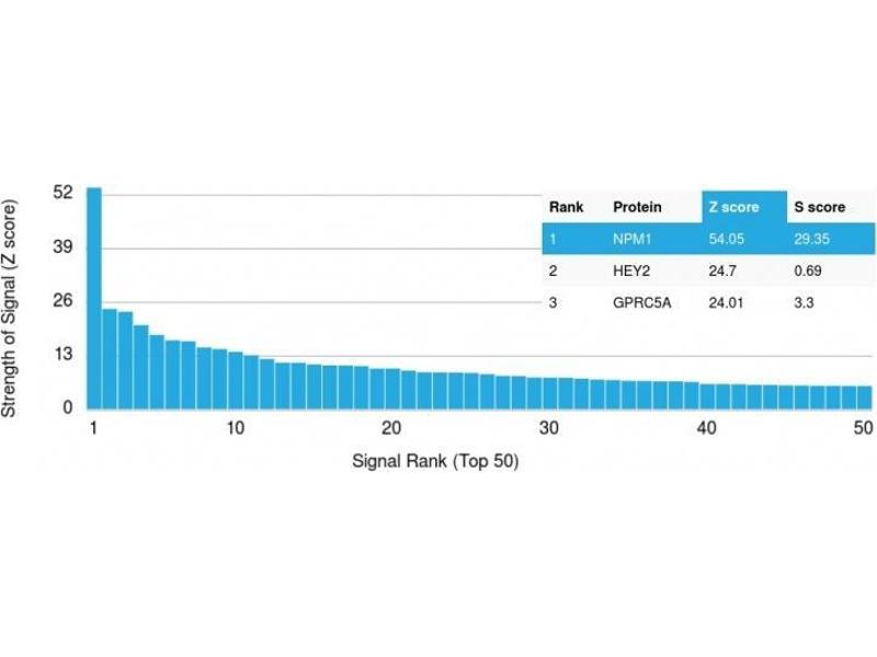 - Recognizes a 33 kDa glycoprotein, identified as Nucleophosmin (NPM). It is predominantly localized in the nucleus of cells in most tissues. NPM is involved in ribosomal assembly and rRNA transport. It is an abundant protein that is highly phosphorylated by Cdc2 kinase during mitosis. This phosphoprotein moves between the nucleus and the cytoplasm. It is thought to be involved in several processes including regulation of the ARF/p53 pathway. A number of genes are fusion partners, in particular the anaplastic lymphoma kinase gene on chromosome 2. Mutations in exon 12 affecting the C-terminus of the protein are associated with an aberrant cytoplasmic location. Mutations in this gene are associated with acute myeloid leukemia.The antibody may be a useful aid for classification of acute myeloid leukemia.