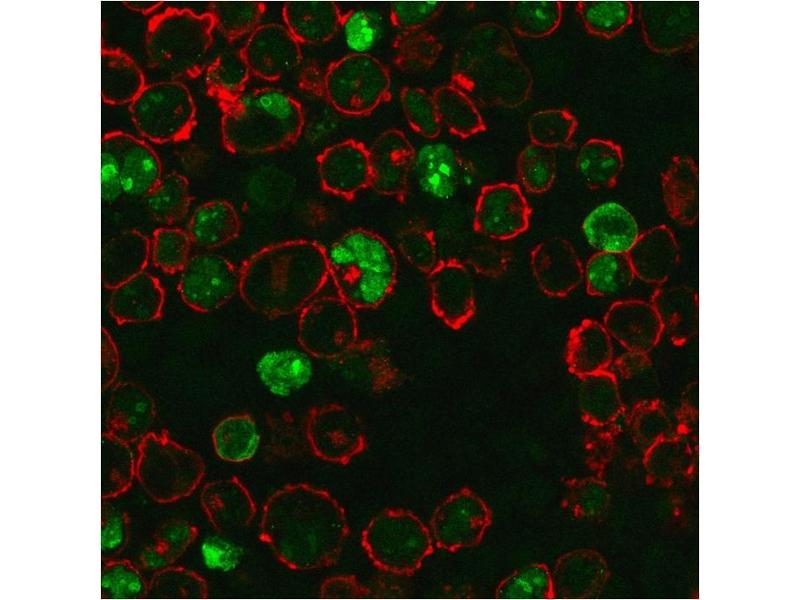 - Recognizes a 33 kDa glycoprotein, identified as Nucleophosmin (NPM). It is predominantly localized in the nucleus of cells in most tissues. NPM is involved in ribosomal assembly and rRNA transport. It is an abundant protein that is highly phosphorylated by Cdc2 kinase during mitosis. This phosphoprotein moves between the nucleus and the cytoplasm. It is thought to be involved in several processes including regulation of the ARF/p53 pathway. A number of genes are fusion partners, in particular the anaplastic lymphoma kinase gene on chromosome 2. Mutations in exon 12 affecting the C-terminus of the protein are associated with an aberrant cytoplasmic location. Mutations in this gene are associated with acute myeloid leukemia. The antibody may be a useful aid for classification of acute myeloid leukemia.