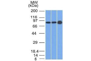 Recognizes a protein of 75 kDa, identified as Plakophilin-1. Its epitope maps between aa 1-27 human Plakophilin-1. Plakophilins 1, 2, 3 and 4 (PKP1-4) influence development and participate in linking cadherins to cytoskeletal intermediate filaments. Plakophilins 1-4 contain arm-repeat (armadillo) domains and localize to nuclei and cell desmosomes (cell-cell junctions found in suprabasal layers of stratifying epithelia that undergo mechanical stress). Plakophilin 2 is important for desmosome assembly and is an essential morphogenic factor and architectural component of the heart.