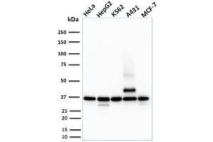 Positive Control: K562, HeLa or MCF-7 cells. Colon or breast Carcinoma.