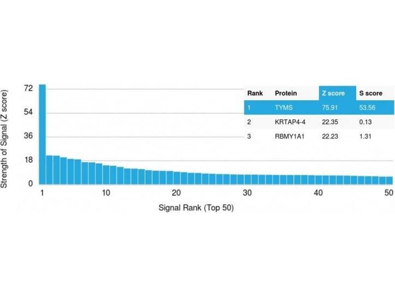 - It recognizes a protein of 36 kDa, identified as Thymidylate Synthase (TS) (EC 2.1.1.45). It converts deoxyuridine monophosphate (dUMP) to deoxythymidine monophosphate (dTMP), which is essential for DNA biosynthesis. TS is also a critical target for the fluoropyrimidines, an important group of antineoplastic drugs that are widely used in the treatment of solid tumors. Both 5-FU and fluorodeoxyuridine are converted in tumor cells to FdUMP which inactivates TS by formation of a ternary covalent complex in the presence of the folate cofactor 5,10-methylenetetrahydrofolate. Expression of TS protein has been reported to associate with response to 5-fluorouracil (5-FU) in human colorectal, gastric, head and neck, and breast carcinomas.