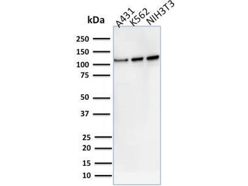 Positive Control: A431, K562, NIH3T3, U-87, THP-1 cells. Human Bladder and Testis.