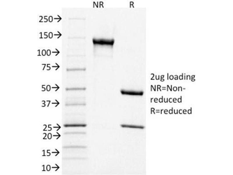 Known Application: ELISA (Use Ab at 2-4 μg/mL for coating) (Order Ab without BSA), Flow Cytometry (1-2 μg/million cells), Western Blot (1-2 μg/mL), ,Immunohistochemistry (Formalin-fixed) (1-2 μg/mL for 30 minutes at RT),(Staining of formalin-fixed tissues requires boiling tissue sections in 10 mM Tris buffer with 1 mM EDTA, pH 9.0, for 10-20 min followed by cooling at RT for 20 minutes),Optimal dilution for a specific application should be determined.
