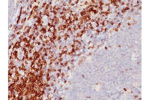 - Recognizes a 67 kDa transmembrane protein, which is identified as CD5. The CD5 antigen is found on 95 % of thymocytes and 72 % of peripheral blood lymphocytes. In lymph nodes, the main reactivity is observed in T cell areas. Anti-CD5 is a pan T-cell marker that also reacts with a range of neoplastic B-cells, e.g. chronic lymphocytic leukemia/small lymphocytic lymphoma (CLL/SLL), mantle cell lymphoma, and a subset (~10 %) of diffuse large B-cell lymphoma. CD5 aberrant expression is useful in making a diagnosis of mature T-cell neoplasms. Anti-CD5 detection is diagnostic in CLL/SLL within a panel of other B-cell markers, especially one that includes anti-CD23. Anti-CD5 is also very useful in differentiating among mature small lymphoid cell malignancies. In addition, anti-CD5 can be used in distinguishing thymic carcinoma (+) from thymoma (-). Anti-CD5 does not react with granulocytes or monocytes.