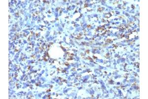 - This antibody recognizes a glycoprotein of 110 kDa, which is identified as CD68. It is important for identifying macrophages in tissue sections. It stains macrophages in a wide variety of human tissues, including Kupffer cells and macrophages in the red pulp of the spleen, in lamina propria of the gut, in lung alveoli, and in bone marrow. It reacts with myeloid precursors and peripheral blood granulocytes. It also reacts with plasmacytoid T cells, which are supposed to be of monocyte/macrophage origin. It shows strong granular cytoplasmic staining of chronic and acute myeloid leukemia and also reacts with rare cases of true histiocytic neoplasia. Lymphomas are negative or show few granules.
