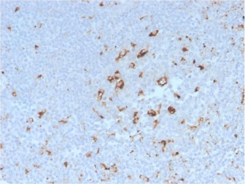 - This antibody recognizes a glycoprotein of 110 kDa, which is identified as CD68. It is important for identifying macrophages in tissue sections. It stains macrophages in a wide variety of human tissues, including Kupffer cells and macrophages in the red pulp of the spleen, in lamina propria of the gut, in lung alveoli, and in bone marrow. It reacts with myeloid precursors and peripheral blood granulocytes. It also reacts with plasmacytoid T cells, which are supposed to be of monocyte/macrophage origin. It shows strong granular cytoplasmic staining of chronic and acute myeloid leukemia and also reacts with rare cases of true histiocytic neoplasia. Lymphomas are negative or show few granules.
