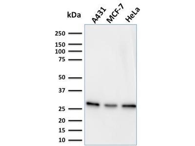 Known Application: Western Blot (0.5-1.0 μg/mL) Immunohistochemistry (Formalin-fixed) (1-2 μg/mL for 30 minutes at RT) (Staining of formalin-fixed tissues requires boiling tissue sections in 10 mM citrate buffer, pH 6.0, for 10-20 min followed by cooling at RT for 20 minutes) Optimal dilution for a specific application should be determined.