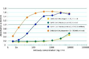 - This antibody is recommended for detection of SARS CoV2 protein N (nucleoprotein). This antibody binds both the nucleocapsid protein of the SARS-CoV and SARS CoV-2 (2019-nCoV). Initial characterization of the antibody for binding to 2019-nCoV was done using ELISA. This antibody shows potential to be used for development of diagnostic assays. Various isotype versions of the antibody namely human IgG1, IgG3, IgM, IgA and the less common IgG2 and IgG4 are available for the investigation of their role in response to SARS CoV2. Competitive ELISA of this antibody with CR3009 suggests that both these antibodies bind different epitopes of the N protein of SARS CoV. Thus, a combination of these two antibodies is suggested for virus capture assays. Immunofluorescence staining was used to demonstrate binding of CR3018 to SARS-CoV infected Vero cells. (PMID:15650189)