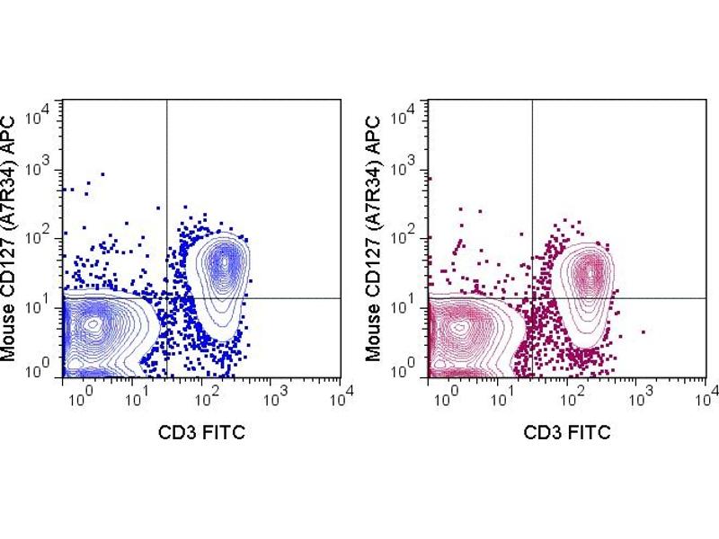 - The A7R34 antibody is specific for mouse CD127, a 60-90 kDa cell surface protein also known as the Interleukin-7 Receptor alpha chain, or IL-7R alpha. CD127 is typically expressed at the cell surface as a heterodimer with the common gamma chain (CD132). This complex acts as the functional receptor for IL-7, a cytokine important in T and B cell development, and in mature T cell homeostasis. A second cytokine known as Thymic Stromal Lymphopoietin (TSLP) also binds to a receptor complex of CD127 and the TSLPR chain to trigger activation of dendritic cells, and is involved in B cell development, allergy and autoimmunity.The A7R34 antibody may be used as a phenotypic marker for CD127 on immature B cells, on subsets of thymocytes which are double negative (CD4-CD8- ) or single positive (CD4+ or CD8+), and at low levels on mature, peripheral T cells. CD127 is a key marker, when used in combination with CD4 and CD25, to distinguish Treg and effector/memory Treg populations known as T(REM).