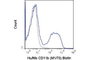 The M1/70 antibody reacts with human and mouse CD11b, also known as integrin alpha M. This 165-170 kDa cell surface glycoprotein is part of a family of integrin receptors that mediate adhesion between cells (cell-cell) and components of the extracellular matrix, e.g. fibrinogen (cell-matrix). In addition, integrins are active signaling receptors which recruit leukocytes to inflammatory sites and promote cell activation. Complete, functional integrin receptors consist of distinct combinations of integrin chains which are differentially expressed. Integrin alpha M (CD11b) assembles with Integrin beta-2 (CD18) into a receptor known as Macrophage Antigen-1 (Mac-1) or complement receptor type 3 (CR3). This receptor binds and induces intracellular signaling through ICAM-1 on endothelial cells and can also facilitate removal of iC3b bearing foreign cells.The M1/70 antibody is widely used as a marker for CD11b expression on mouse macrophages, granulocytes, neutrophils, and NK cells. The antibody is also reported to be cross-reactive for Rhesus macaque CD11b.