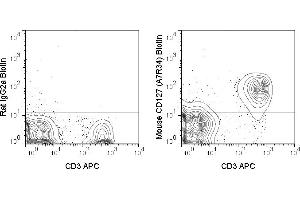 - The A7R34 antibody is specific for mouse CD127, a 60-90 kDa cell surface protein also known as the Interleukin-7 Receptor alpha chain, or IL-7R alpha. CD127 is typically expressed at the cell surface as a heterodimer with the common gamma chain (CD132). This complex acts as the functional receptor for IL-7, a cytokine important in T and B cell development, and in mature T cell homeostasis. A second cytokine known as Thymic Stromal Lymphopoietin (TSLP) also binds to a receptor complex of CD127 and the TSLPR chain to trigger activation of dendritic cells, and is involved in B cell development, allergy and autoimmunity.The A7R34 antibody may be used as a phenotypic marker for CD127 on immature B cells, on subsets of thymocytes which are double negative (CD4-CD8- ) or single positive (CD4+ or CD8+), and at low levels on mature, peripheral T cells. CD127 is a key marker, when used in combination with CD4 and CD25, to distinguish Treg and effector/memory Treg populations known as T(REM).