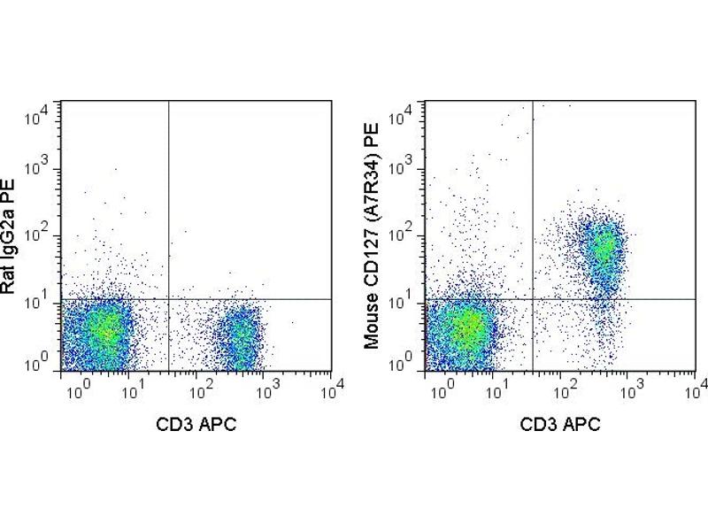 - The A7R34 antibody is specific for mouse CD127, a 60-90 kDa cell surface protein also known as the Interleukin-7 Receptor alpha chain, or IL-7R alpha. CD127 is typically expressed at the cell surface as a heterodimer with the common gamma chain (CD132). This complex acts as the functional receptor for IL-7, a cytokine important in T and B cell development, and in mature T cell homeostasis. A second cytokine known as Thymic Stromal Lymphopoietin (TSLP) also binds to a receptor complex of CD127 and the TSLPR chain to trigger activation of dendritic cells, and is involved in B cell development, allergy and autoimmunity.The A7R34 antibody may be used as a phenotypic marker for CD127 on immature B cells, on subsets of thymocytes which are double negative (CD4-CD8- ) or single positive (CD4+ or CD8+), and at low levels on mature, peripheral T cells. CD127 is a key marker, when used in combination with CD4 and CD25, to distinguish Treg and effector/memory Treg populations known as T(REM).