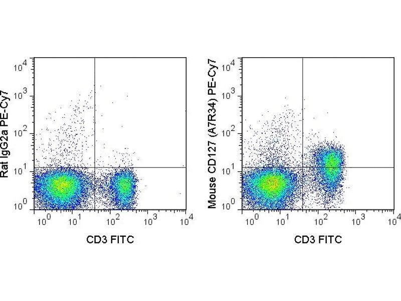 - The A7R34 antibody is specific for mouse CD127, a 60-90 kDa cell surface protein also known as the Interleukin-7 Receptor alpha chain, or IL-7R alpha. CD127 is typically expressed at the cell surface as a heterodimer with the common gamma chain (CD132). This complex acts as the functional receptor for IL-7, a cytokine important in T and B cell development, and in mature T cell homeostasis. A second cytokine known as Thymic Stromal Lymphopoietin (TSLP) also binds to a receptor complex of CD127 and the TSLPR chain to trigger activation of dendritic cells, and is involved in B cell development, allergy and autoimmunity.The A7R34 antibody may be used as a phenotypic marker for CD127 on immature B cells, on subsets of thymocytes which are double negative (CD4-CD8- ) or single positive (CD4+ or CD8+), and at low levels on mature, peripheral T cells. CD127 is a key marker, when used in combination with CD4 and CD25, to distinguish Treg and effector/memory Treg populations known as T(REM).