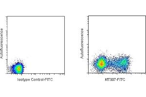- Detection of IFN-γ producing cells by flow cytometry. 5 μL is recommended for staining of 1 million cells in a total volume of 50 μL. Detection of IFN-γ by flow cytometry in bovine peripheral blood mononuclear cells (PBMC). Bovine PBMC were stimulated with PMA/ionomycin for 16 hours in the presence of Brefeldin A. The cells were then fixed and permeabilized using 4 % paraformaldehyde and saponin, and subsequently stained with anti-bovine IFN-γ mAb MT307-FITC (right panel). The left panel depicts stimulated cells stained with a matched isotype control antibody. The dot plots derive from a lymphocyte gate. Flow cytometry was performed on a Guava EasyCyte Mini.