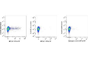 - Detection of IFN-γ producing cells by flow cytometry. 5 μL is recommended for staining of 1 million cells in a total volume of 50 μL. Detection of IFN-γ by flow cytometry in viable bovine PBMC. Cells were stimulated for 16 hours in the presence of PHA and Brefeldin A. Cells were then fixed and permeabilized using 4 % paraformaldehyde and saponin, and subsequently stained with MT307-PF647P (left panel). The specificity of MT307-PF647P was demonstrated by pre-incubating the antibody with recombinant bovine IFN-γ prior to staining of PBMC (middle panel). Matched isotype control antibody (right panel). The histogram derives from gated events of typical lymphocyte characteristics in forward and side light scatter. Flow cytometry was performed on a BD FACSVerse system.