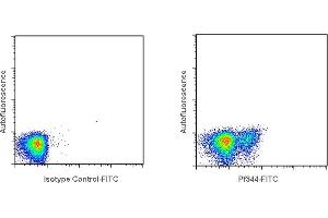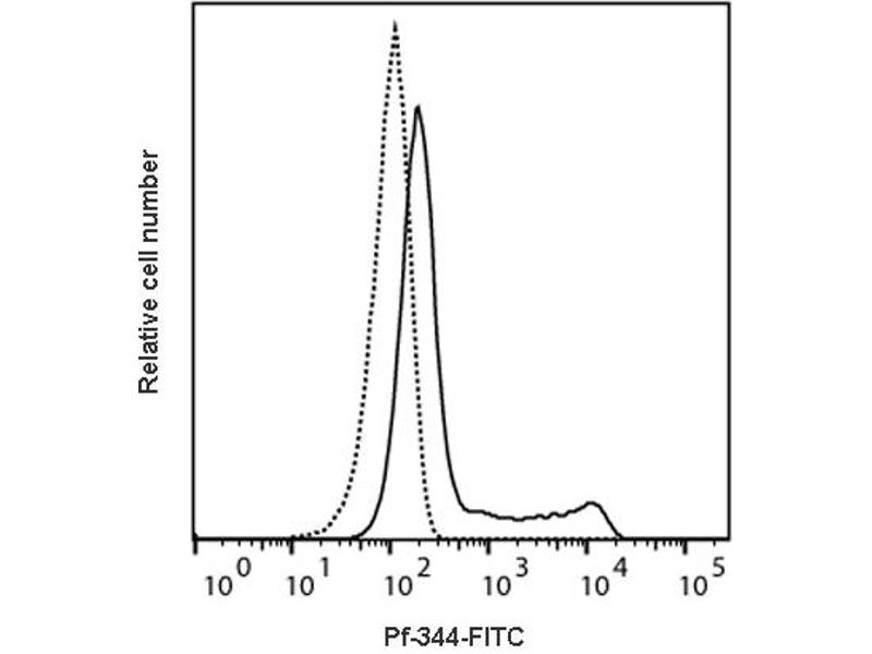 Detection of Perforin producing cells by flow cytometry. 5 μL is recommended for staining of 1 million cells in a total volume of 50 μL. Detection of Perforin by flow cytometry in viable human peripheral blood mononuclear cells (PBMC). Human PBMC were fixed and permeabilized using 4 % paraformaldehyde and saponin, and subsequently stained with Pf-344-FITC (solid line). Matched isotype control antibody (dashed line). The histogram derives from gated events of typical lymphocyte characteristics in forward and side light scatter. Flow cytometry was performed on a BD FACSVerse system.