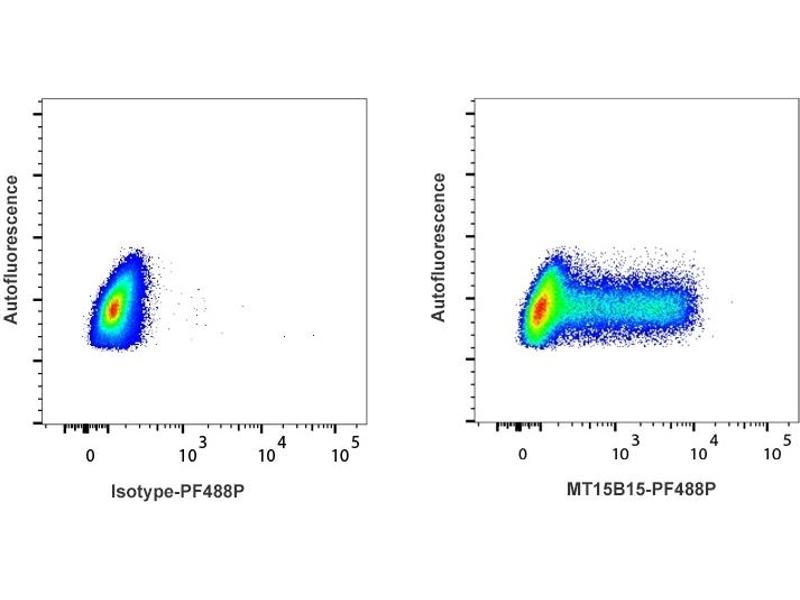 - Detection of TNF-α producing cells by flow cytometry. 5 μL is recommended for staining of 1 million cells in a total volume of 50 μL. Detection of TNF-α by flow cytometry in viable PBMC from Rhesus macaque. Cells were stimulated for 4 hours in the presence of PMA/ionomycin and Brefeldin A. Cells were fixed and permeabilized using 4 % paraformaldehyde and saponin, and further stained with MT15B15-PF488P (right panel). Matched isotype control antibody (left panel). The dot plot derives from gated events of typical lymphocyte characteristics in forward and side light scatter. Flow cytometry was performed on a BD FACSVerse system.