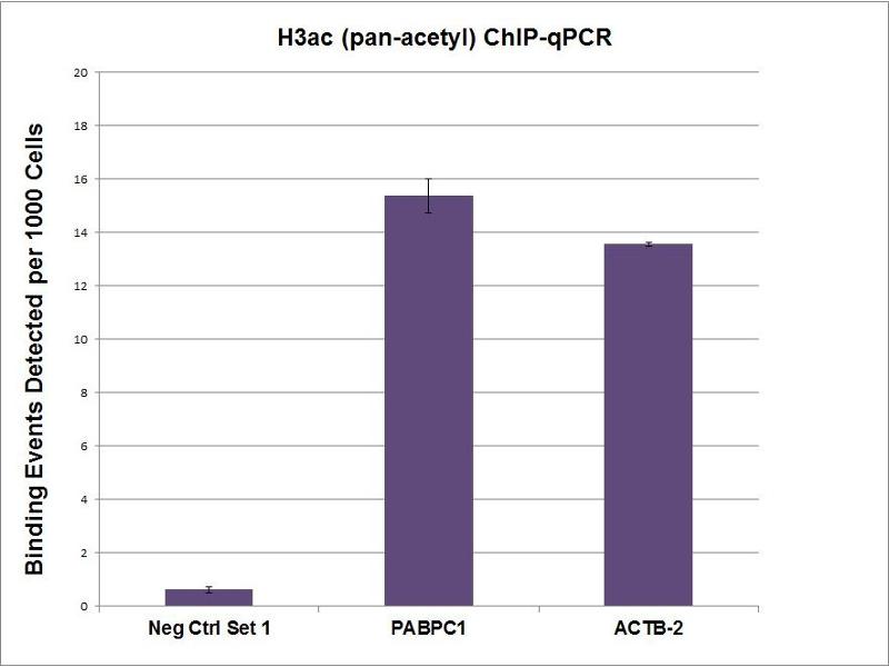 - Histone H3 is one of the core components of the nucleosome. The nucleosome is the smallest subunit of chromatin and consists of 147 base pairs of DNA wrapped around an octamer of core histone proteins (two each of Histone H2A, Histone H2B, Histone H3 and Histone H4). Histone H1 is a linker histone, present at the interface between the nucleosome core and DNA entry/exit points, it is responsible for establishing higher-order chromatin structure. Chromatin is subject to a variety of chemical modifications, including post-translational modifications of the histone proteins and the methylation of cytosine residues in the DNA. Reported histone modifications include acetylation, methylation, phosphorylation, ubiquitylation, glycosylation, ADP-ribosylation, carbonylation and SUMOylation, they play a major role in regulating gene expression. Lysine N-e-acetylation is a dynamic, reversible and tightly regulated protein and histone modification that plays a major role in chromatin remodeling and in the regulation of gene expression in various cellular functions. Acetylation of histone H3 occurs at several different lysine positions in the histone tail, and is performed by Histone Acetyltransferases (HATs) such as CBP/p300. Acetylation of histones is often associated with transcriptional activation. Histone H3ac (pan-acetyl) antibody (pAb) was raised in a Rabbit host. It has been validated for use in Chromatin Immunoprecipitation, Dot blot, Immunofluorescence and Western blot, it has been shown to react with Human samples, but it is predicted that it will react with a wide range of sample types.