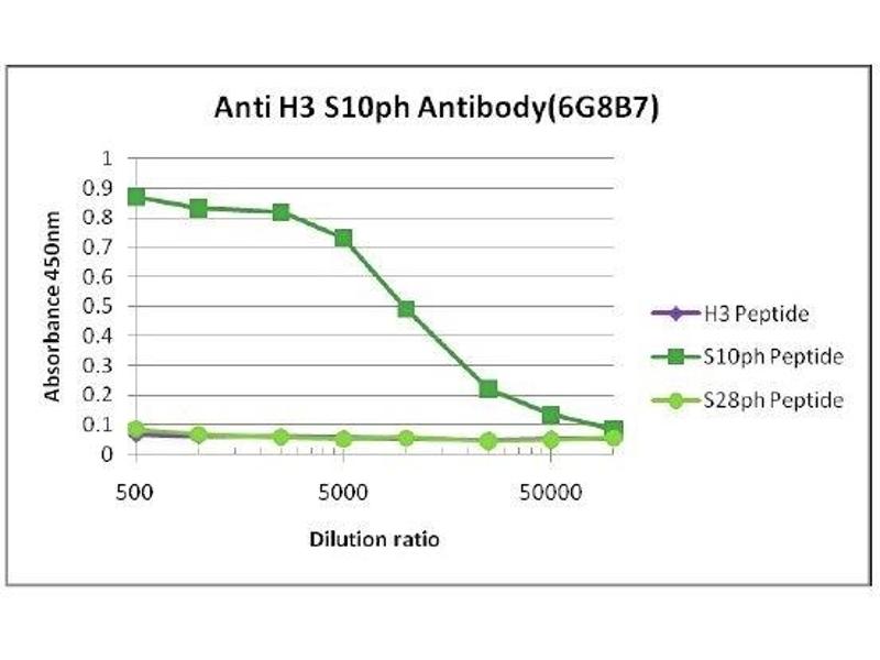 - Histone H3 is one of the core components of the nucleosome. The nucleosome is the smallest subunit of chromatin and consists of 147 base pairs of DNA wrapped around an octamer of core histone proteins (two each of Histone H2A, Histone H2B, Histone H3 and Histone H4). Chromatin is subject to a variety of chemical modifications, including post-translational modifications of the histone proteins and the methylation of cytosine residues in the DNA. Reported histone modifications include acetylation, methylation, phosphorylation, ubiquitylation, glycosylation, ADP-ribosylation, carbonylation and SUMOylation, these modifications play a major role in regulating gene expression. Interestingly, phosphorylation of Ser10 on histone H3 is involved in both transcription and cell division, two events requiring opposite alterations in the degree of chromatin compaction. Ser10 in the tail of histone H3 is strongly phosphorylated early in mitosis when chromosomes begin to condense, and during premature chromosome condensation induced in S-phase cells. Histone H3S10ph antibody (mAb) (Clone 6G8B7) was raised in a Rat host. It has been validated for use in ELISA, Immunocytochemistry, Immunofluorescence and Western blot, it has been shown to react with Human samples, but it is predicted that it will react with a wide range of sample types.