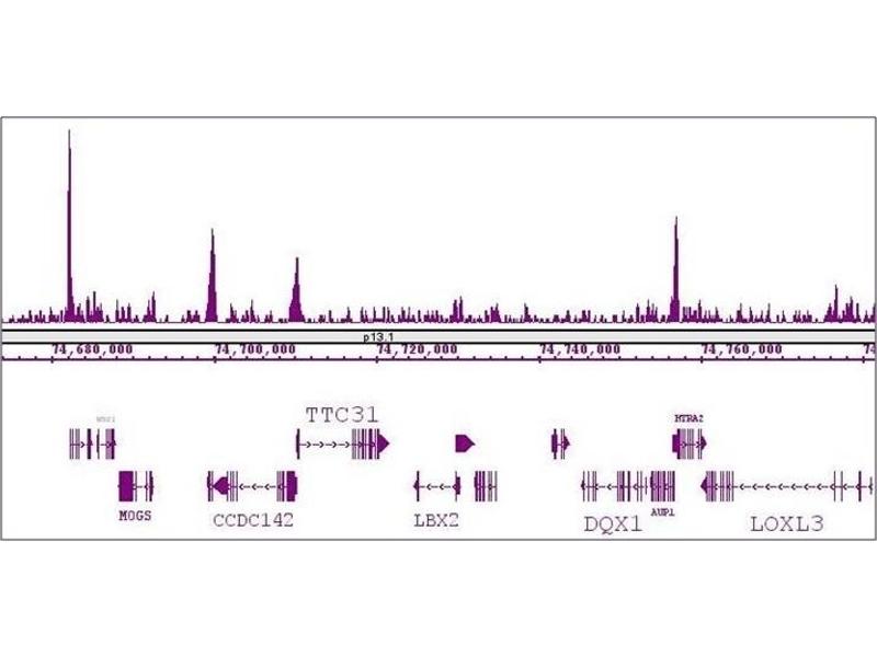 KLF5 (Kruppel-like factor 5, IKLF, Basic transcription element-binding protein 2, BTEB2) is a zinc-finger transcription factor that plays a role in cell proliferation, differentiation, cell cycle regulation, angiogenesis, and carcinogenesis and is especially important in epithelial cells. KLF5 (along with KLF2 and KLF4) are highly expressed in undifferentiated mouse embryonic stem cells and downregulated during early stages of differentiation. KLF5 and KLF2 can substitute for KLF4 in the reprogramming of differentiated cells into stem cells. KLF5 has a pro-proliferative role in cells and loss of both alleles of KLF5 is embryonic lethal. KLF5 antibody (pAb) was raised in a Rabbit host. It has been validated for use in Chromatin Immunoprecipitation, ChIP-Seq, Immunocytochemistry, Immunofluorescence and Western blot, it has been shown to react with Human and Mouse samples.