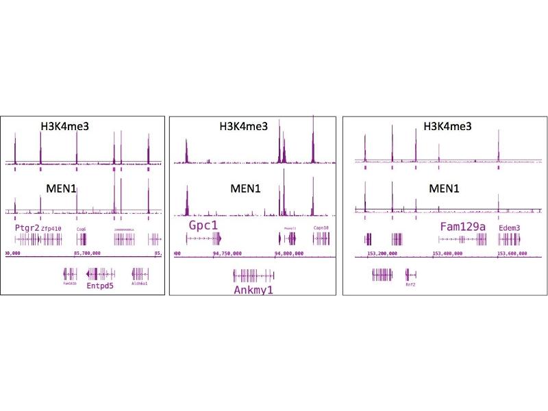 Menin (MEN1, SCG2) is a tumor suppressor and a component of multiple MLL-containing protein complexes (MLL, ACSOM, MLL2/3 and MLL3/4), which methylate histone H3 at lysine 4. Menin interacts directly with MLL through a domain in the N-terminus of MLL. It also interacts with RNA polymerase II large subunit C-terminal domain phosphorylated at Ser5. Menin is involved in the activation of HOX gene expression and is localized along with MLL at several HOX gene promoters. It is also important for activating the expression of several cell cycle regulators, indicating a mechanism for its role as a tumor suppressor. Defects in Menin are associated with inherited Multiple Endocrine Neoplasia type I, a dominant predisposition to cancer of a number of endocrine tissues. Menin antibody (pAb) was raised in a Rabbit host. It has been validated for use in Chromatin Immunoprecipitation, ChIP-Seq and Western blot, it has been shown to react with Human and Mouse samples.