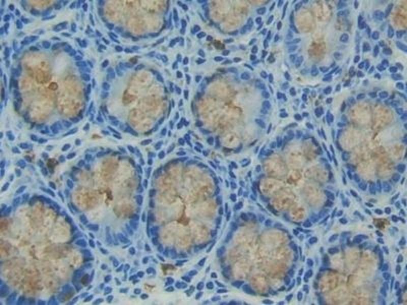 The antibody is a rabbit polyclonal antibody raised against TFF3. It has been selected for its ability to recognize TFF3 in immunohistochemical staining and western blotting.