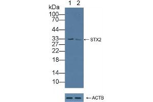 - The antibody is a rabbit polyclonal antibody raised against STX2. It has been selected for its ability to recognize STX2 in immunohistochemical staining and western blotting.