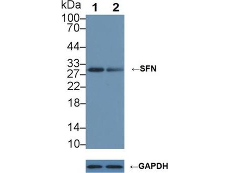 - The antibody is a rabbit polyclonal antibody raised against SFN. It has been selected for its ability to recognize SFN in immunohistochemical staining and western blotting.