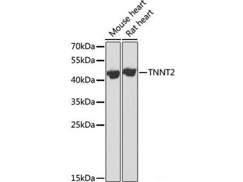 Der Kaninchen Polyklonal Anti-Cardiac Troponin T2 Antikörper wurde für WB validiert. Er ist geeignet, Cardiac Troponin T2 in Proben von Maus und Ratte zu detektieren.