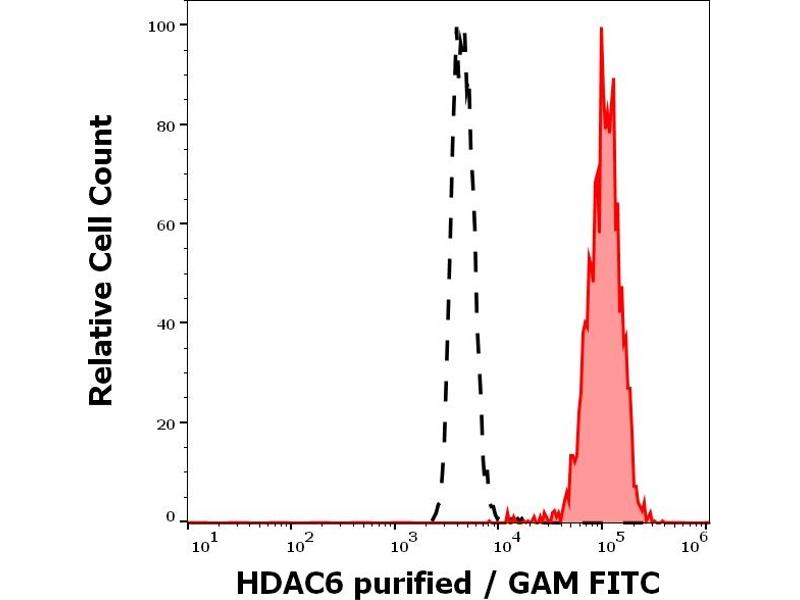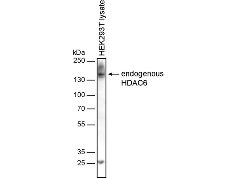Histone deacetylase 6,Histone deacetylase 6 (HDAC6), like other histone deacetylases, affects gene expression by regulation of chromatin remodeling. HDAC6 contains an internal duplication of two catalytic domains which appear to function independently of each other. Besides histones, HDAC6 deacetylates also other substrates including alpha tubulin and HSP90 alpha, and is involved in protein trafficking and degradation, as well as in affecting of cell shape and migration. Deregulation of HDAC6 expression and activity is associated with many diseases.,Histone deacetylase 6