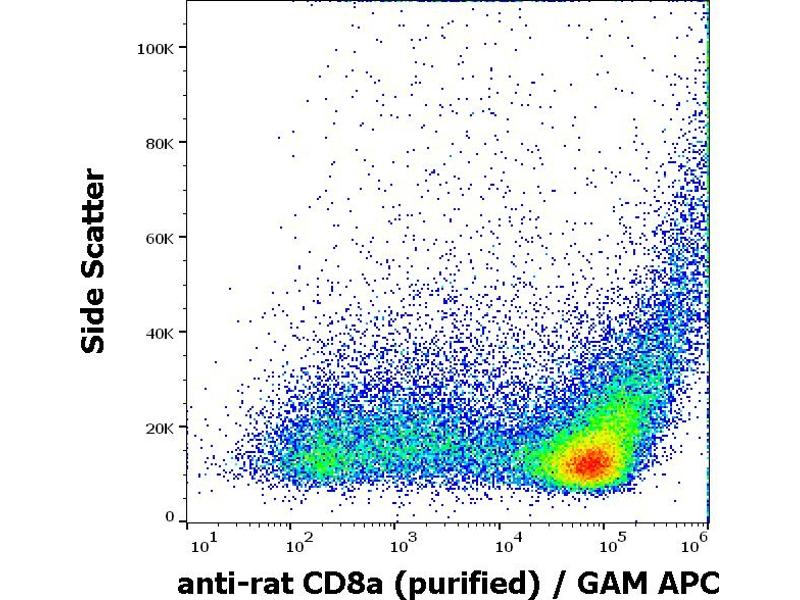 The mouse monoclonal antibody OX-8 recognizes the hinge-like membrane-proximal extracellular domain of rat CD8a (32-34 kDa, alpha chain of the CD8 antigen).