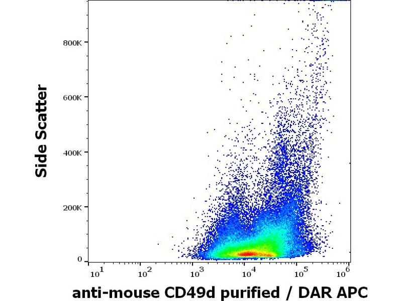 Integrin subunit alpha 4,CD49d (integrin alpha 4), also known as very late antigen 4 alpha (VLA-4 alpha) is a cell surface glycoprotein constituting integrin complexes. CD49d heterodimerizes with CD29 (integrin beta 1) to form VLA-4 antigen, which is involved in cell-cell and cell-extracellular matrix interactions, which is a receptor for CD106 (VCAM) and fibronectin. CD79d also heterodimerizes with integrin beta 7 to form LPAM-1, which binds to MAdCAM-1 (mucosal vascular addressin). These interactions are important for cell adhesion and activation.,Itga4, Vla-4 alpha