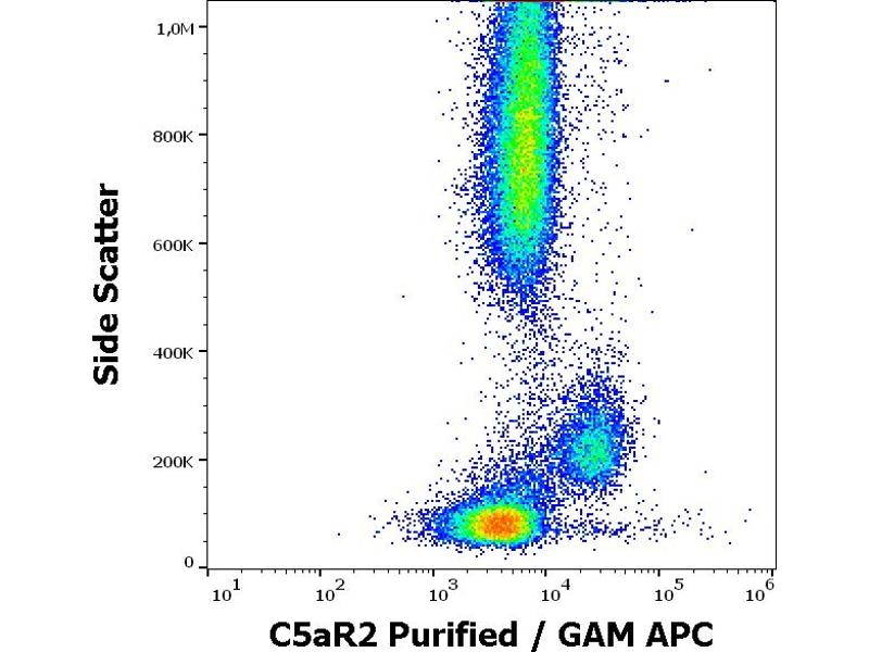 The mouse monoclonal antibody 1D9-M12 recognizes an extracellular epitope on C5aR2 (C5L2), a C5a complement receptor, which is coexpressed with C5aR1 (CD88) in neutrophils, as well as e.g. in mast cells, astrocytes, or macrophages.