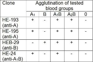 The antibody HE-193 recognizes human blood group A (monofucosyl and difucosyl A antigens with chain types 1 and 2, A antigens with chain types 3, 4, 5, 6) and Forssman antigen.