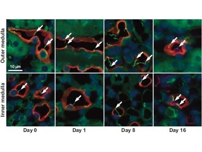 AQP1, Aquaporin-CHIP, CHIP28, Urine water channel, Water channel protein for red blood cells and kidney proximal tubule,Aquaporin 1 (AQP-1) belongs to a family of membrane proteins that allow passage of water and certain other solutes through biological membranes. The family is composed of 13 members (AQP-0 to AQP-12).The aquaporins can be divided into two functional groups based on their permability characteristics: the aquaporins that are only permeated by water and the aquaglyceroporins that are permeated by water and other small solutes such as glycerol. AQP-1 together with AQP-2, AQP-4 and AQP-5 belongs to the first group1.Little is known about the function of the two newest members, AQP-11 and AQP-12.The proteins present a conserved structure of six transmembrane domains with intracellular N- and C-termini. The functional channel is a tetramer but each subunit has a separate pore and therefore the functional channel unit, contains four pores1.AQP-1 is widely expressed in several organs with prominent expression found in kidney, lung, red blood cells intestine and brain. Studies with mice lacking AQP-1 show that the channel has a critical role in urine concentration2. In addition, AQP-1 expression in tumor cells was shown to contribute to enhanced tumor spread and metastatic potential3.