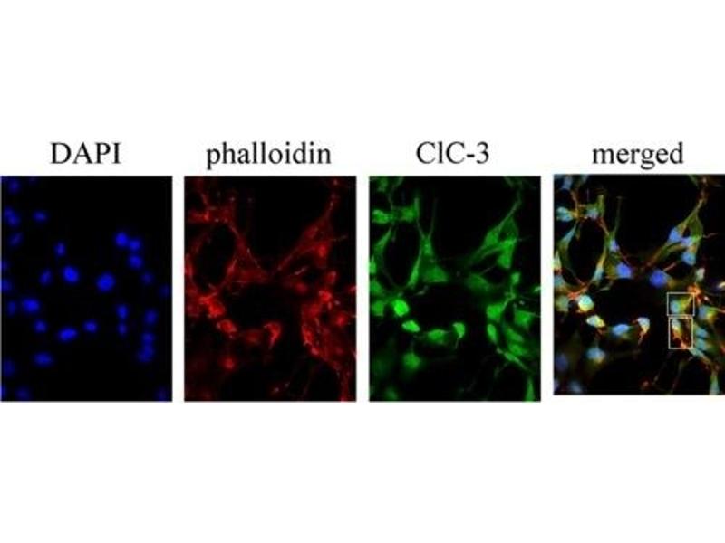 Chloride channel 3, Chloride transporter ClC-3, H+/Cl- exchange transporter 3,CLC-3 is a member of the voltage-dependent Cl- channel (CLC) family that includes nine known members in mammals. CLC channels can be classified as plasma membrane channels and intracellular organelle channels. The first group includes the CLC-1, CLC-2 CLC-Ka and CLCKb channels. The second group comprises the CLC-3, CLC-4, CLC-5, CLC-6 and CLC-7.CLC channels that function in the plasma membrane are involved in the stabilization of membrane potential and in transepithelial transport. The presumed function of the intracellular CLC channels is support of the acidification of the intraorganellar compartment. In this regard, recent reports indicate that ClC-4 and ClC-5 (and by inference ClC-3) can function as Cl-/H+ antiporters.1, 2The functional unit of the CLC channels is a dimer with each subunit forming a proper pore. Although the crystal structure of bacterial CLC channels was resolved, the topology of the CLC channels is complex and has not been fully elucidated. It is generally accepted that both the N- and C- terminus domains are intracellular while the number and configuration of the transmembrane domains vary greatly between different models. 1,2CLC-3 is widely distributed with prominent expression in tissues of neuroectoderm origin. In the brain, it is highly expressed in the hippocampus, olfactory bulb and olfactory cortex. The channel is also prominently expressed in aortic and coronary vascular smooth muscle cells, aortic endothelial cells and tracheal and alveolar epithelial cells.The physiological function of CLC-3 is not entirely clear, but it has been suggested that CLC-3 generates a shunt current of chloride for v-H+-ATPases, thereby aiding the acidification of endosomes and synaptic vesicles as well as lysosomes. Disruption of the ClC-3 gene in mice causes severe neuronal loss, leading to a complete loss of the hippocampus in adult mice. In addition, CLC-3 has been shown to have a critical role in the respiratory burst and phagocytosis of polymorphonuclear cells, a key cell type of innate host defense. 3,4
