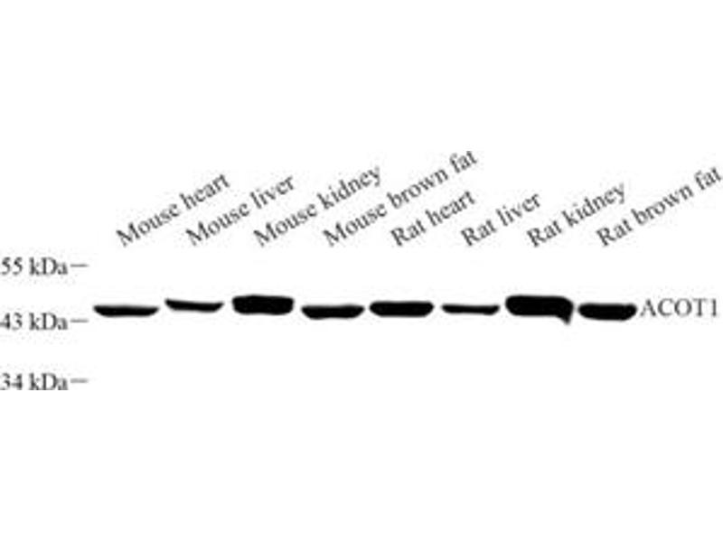 Acyl-CoA thioesterases such as ACOT1, hydrolyze acyl-CoAs to the free fatty acid and CoA. ACOTs therefore play key roles in maintaining the intracellular ratio between CoA esters of various lipids and free fatty acids. Acyl-CoA thioesterases are a group of enzymes that catalyze the hydrolysis of acyl-CoAs to the free fatty acid and coenzyme A (CoASH), providing the potential to regulate intracellular levels of acyl-CoAs, free fatty acids and CoASH.