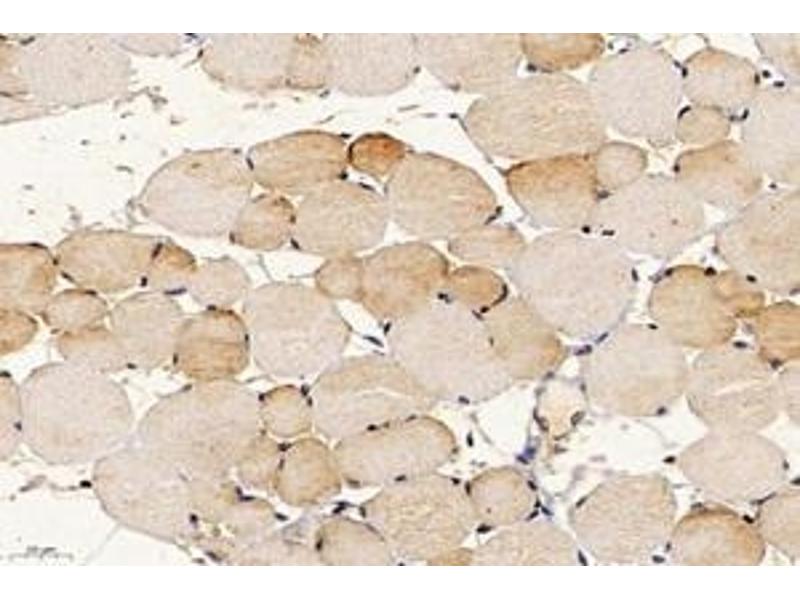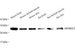 APOBEC2 is a 224 amino acid protein that belongs to the cytidine and deoxycytidylate deaminase family. Expressed exclusively in heart and skeletal muscle, APOBEC2 is thought to be a probable C (cytidine) to U (uridine) editing enzyme. However, unlike other members of the family, such as APOBEC1, which mediates the editing of apolipoprotein (apo) B mRNA, APOBEC2 does not display any detectable apoB mRNA editing activity. Also, APOBEC2 has been shown to have low, but definite, intrinsic cytidine deaminase activity.