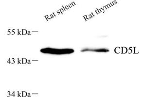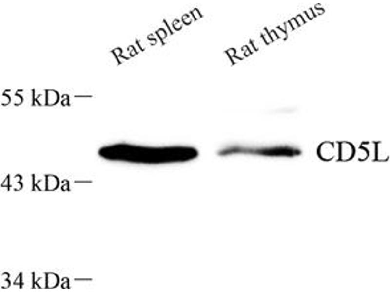 CD5L is a member of the scavenger receptor cysteine-rich domain superfamily (SRCR-SF) initially identified as an inducible cell surface ligand of CD5. It was shown that CD5L functions in the thymus as the inducer of resistance to apoptosis within CD4+/CD8+ thymocytes and as the supporter of the viability of these cells before thymic selection. CD5L was also shown to support macrophage survival and enhance their phagocytic function. More recent experiments using recombinant CD5L significantly inhibited apoptosis of NKT and T cells obtained from C. parvum-stimulated livers in vitro, suggesting that CD5L functions to induce resistance to apoptosis in these cells and supports host defense against inflammation during infection. Expressed in spleen, lymph node, thymus, bone marrow, and fetal liver, but not in non-lymphoid tissues.