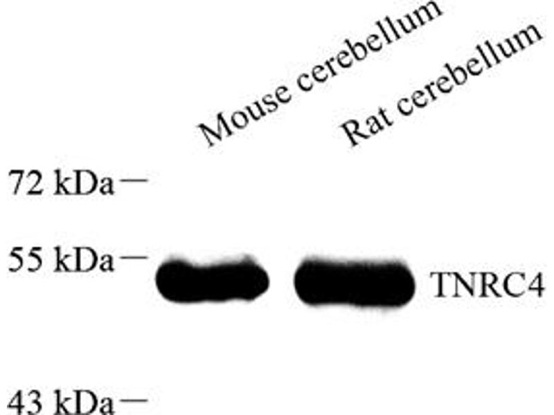 - TNRC4, also named as BRUNOL1, CAGH4, ERDA4, or TNRC4, is a 465 amino acid protein, which contains three RRM (RNA recognition motif) domains and belongs to the CELF/BRUNOL family. TNRC4 localizes in the nucleus and is expressed in brain. TNRC4 as a RNA-binding protein is involved in the regulation of pre-mRNA alternative splicing and mediates exon inclusion and/or exclusion in pre-mRNA that are subject to tissue-specific and developmentally regulated alternative splicing.
