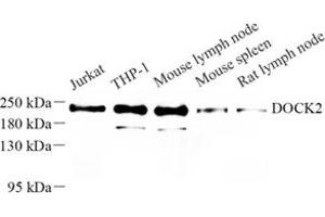 The DOCK2 gene encodes dedicator of cytokinesis 2 (DOCK 2), a hematopoietic cell-specific CDM family protein that is indispensable for lymphocyte chemotaxis. DOCK 2 participates in the cytoskeletal rearrangements that are required for lymphocyte migration in response of chemokines. DOCK 2 may also participate in IL-2 transcriptional activation through the activation of Rac 2. DOCK 2 contains one DHR-1 (CZH-1) domain, one DHR-2 (CZH-2) domain and one SH3 domain. The DHR-2 domain is a putative GEF activity mediator. The DOCK 2 protein also co-localizes with F-Actin, and demonstrates expression in several human tissues, with the highest levels observed in peripheral blood leukocytes, thymus, spleen and liver.