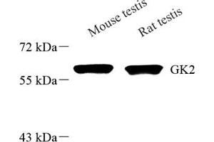 GK2 is a 553 amino acid protein that belongs to the FGGY kinase family and is involved in the pathway of glycerol degradation. Localized to the outer membrane of the mitochondrion and expressed at high levels in testis, GK2 functions to catalyze the ATP-dependent conversion of glycerol to glycerol 3-phosphate. Via its catalytic activity, GK2 plays an essential role in the regulation of glycerol uptake and metabolism. The gene encoding GK2 maps to chromosome 4, which encodes nearly 6 % of the human genome and has the largest gene deserts (regions of the genome with no protein encoding genes) of all of the human chromosomes.