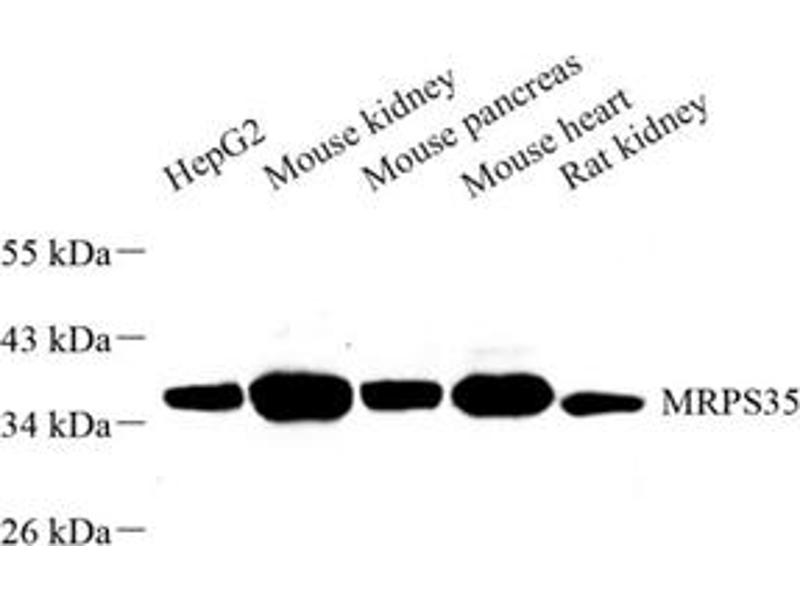 MRPS35 (mitochondrial ribosomal protein S35), also known as MDS023, MRPS28 or HDCMD11P, is a 323 amino acid protein that localizes to the mitochondrion, where it exists as a component of the 28S ribosomal subunit and works in conjunction with other MRPs to mediate protein synthesis. Existing as two alternatively spliced isoforms, MRPS35 is encoded by a gene located on human chromosome 10, which houses over 1,200 genes and comprises nearly 4.5 % of the human genome. This antibody is a rabbit polyclonal antibody raised against the full length MRPS35 protein. It specifically reacts with the 37kd MRPS35protein.