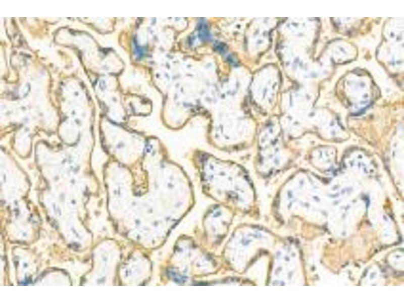 Placental alkaline phosphatase (PLAP) is a glycosyl phosphatidylinositol (GPI)-anchored sialoglycoprotein , which shows greater resistance to heat inactivation than other alkaline phosphatase. Presented at high levels in placental trophoblasts, PLAP is recognized as an important marker of differentiation in human malignancies.