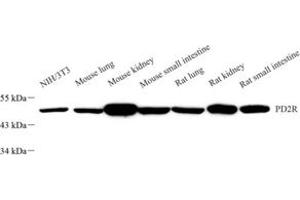 Receptor for prostaglandin D2 (PGD2). The activity of this receptor is mainly mediated by G(s) proteins that stimulate adenylate cyclase, resulting in an elevation of intracellular cAMP. A mobilization of calcium is also observed, but without formation of inositol 1,4,5-trisphosphate . Involved in PLA2G3-dependent maturation of mast cells. PLA2G3 is secreted by immature mast cells and acts on nearby fibroblasts upstream to PTDGS to synthesize PGD2, which in turn promotes mast cell maturation and degranulation via PTGDR.