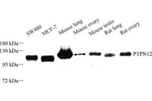 The PTPN12 is a member of the protein tyrosine phosphatase (PTP) family. PTPs are signaling molecules that regulate a variety of cellular processes including cell growth, differentiation, mitotic cycle, and oncogenic transformation. This PTP contains a C-terminal PEST motif, which serves as a protein-protein interaction domain, and may regulate protein intracellular half-life. This PTP was found to bind and dephosphorylate the product of the oncogene c-ABL and thus may play a role in oncogenesis. The PTP was also shown to interact with, and dephosphorylate, various products related to cytoskeletal structure and cell adhesion. This suggests it has a regulatory role in controlling cell shape and mobility.