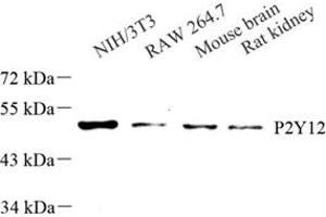 The P2Y receptor family are G protein-coupled receptors which mediate the effects of extracellular nucleotides, primarily through the activation of phospholipase C. To some extent, the P2Y receptors can also activate potassium channels or, alternatively, inhibit adenylate cyclase and N-type calcium channels in response to extracellular nucleotides. Human platelets express two G protein-coupled nucleotide receptors, P2Y1 and P2Y12. P2Y12 is a receptor for ADP and ATP coupled to G-proteins that inhibit the adenylyl cyclase second messenger system. P2Y12 is an integral membrane protein involved in platelet aggregation. It is highly expressed in platelets, with lower levels in the brain, lung, appendix, pituitary and adrenal gland.