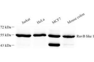 - RUVBL1 is a member of the AAA (ATPase associated with diverse cellular activities) family of proteins that is associated with several chromatin-remodelling complexes and has important roles in transcriptional regulation, the DNA damage response, telomerase activity, snoRNP assembly, cellular transformation and cancer metastasis[PMID: 21617703]. It consists of 456 amino acids (50 kDa) and interacts with TATA-binding protein (TBP), which is a central component for transcriptional regulation by forming complexes with various transcription regulators. RUVBL1 is a component of a large nuclear protein complex, possibly the RNA polymerase II holoenzyme.