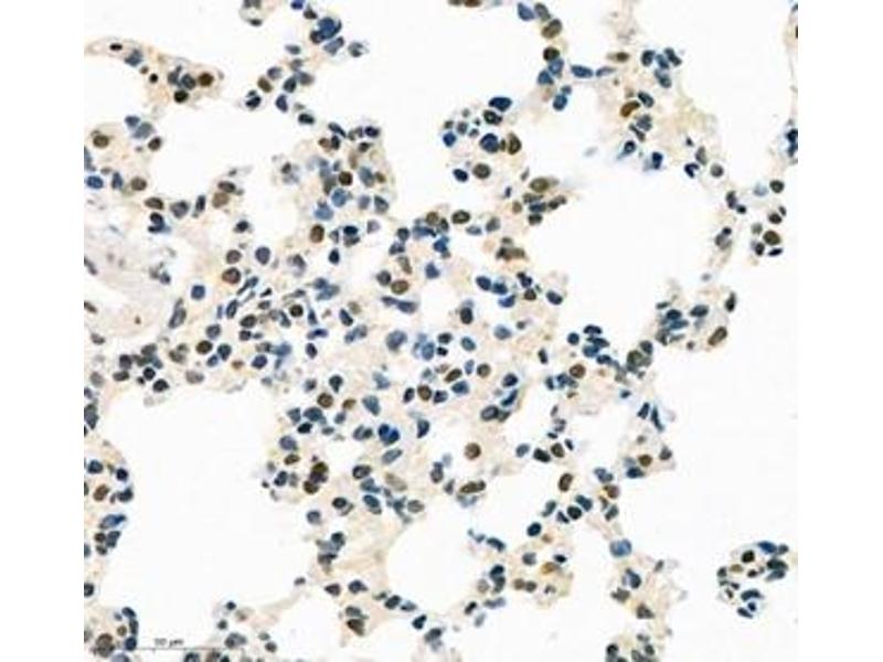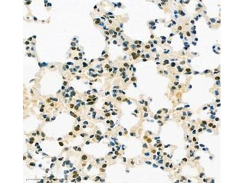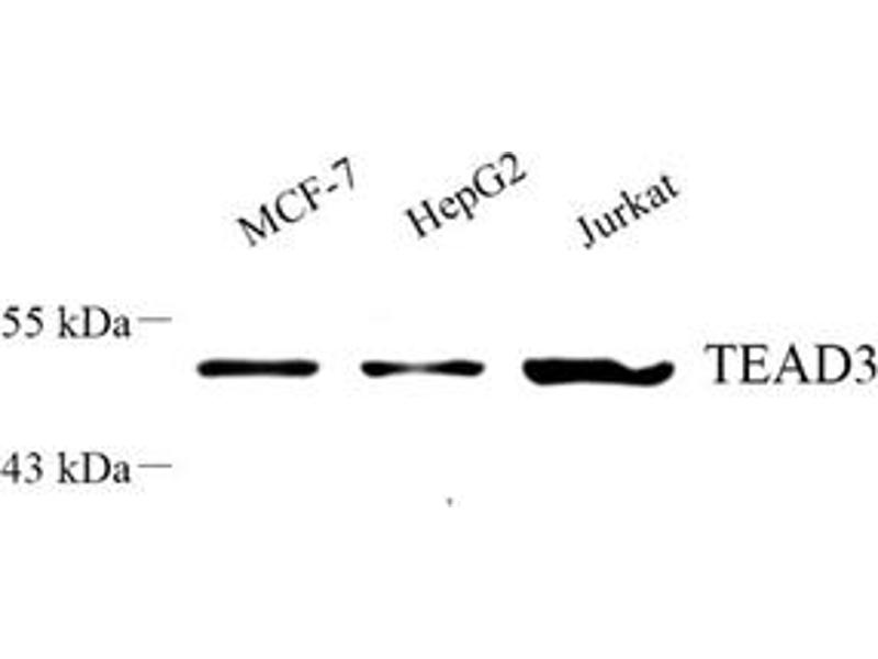 - TEAD3, others named ranscriptional enhancer factor 5(TEF5), a member of family of transcription factors that plays a key role in the Hippo signaling pathway, suggesting involve in organ and tumor suppression by restricting proliferation and promoting. TEAD3 contains the TEA/ATTS DNA-binding domain. Human TEAD3 has a strong mRNA expression in placenta and choriocarcinoma cells(JEG-3), but low in Hela, HepG2 and MCF-7. This is a rabbit polyclonal anti-TEAD3 antibody raised against part of C-terminal chain of human TEAD3.