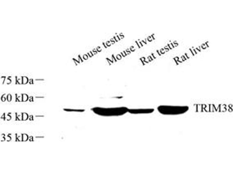 TRIM38 belongs to the TRIM protein family that is involved in various biological processes, including cell proliferation and apoptosis, innate immunity, and inflammatory response. It has been shown that TRIM38 acts as a suppressor in TOLL-like receptor (TLR)-mediated IFN-β induction by promoting degradation of TRAF6 and NAP1 through the ubiquitinproteasome system.